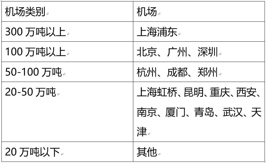 2019年貨郵吞吐量在20萬(wàn)噸以上的共16個(gè)機(jī)場(chǎng),吞吐量之和占全國(guó)總量的80%,是國(guó)家航空貨運(yùn)發(fā)展的未來(lái)所在。各地機(jī)場(chǎng)按貨郵吞吐量大小可分為五類(lèi),如下表示: